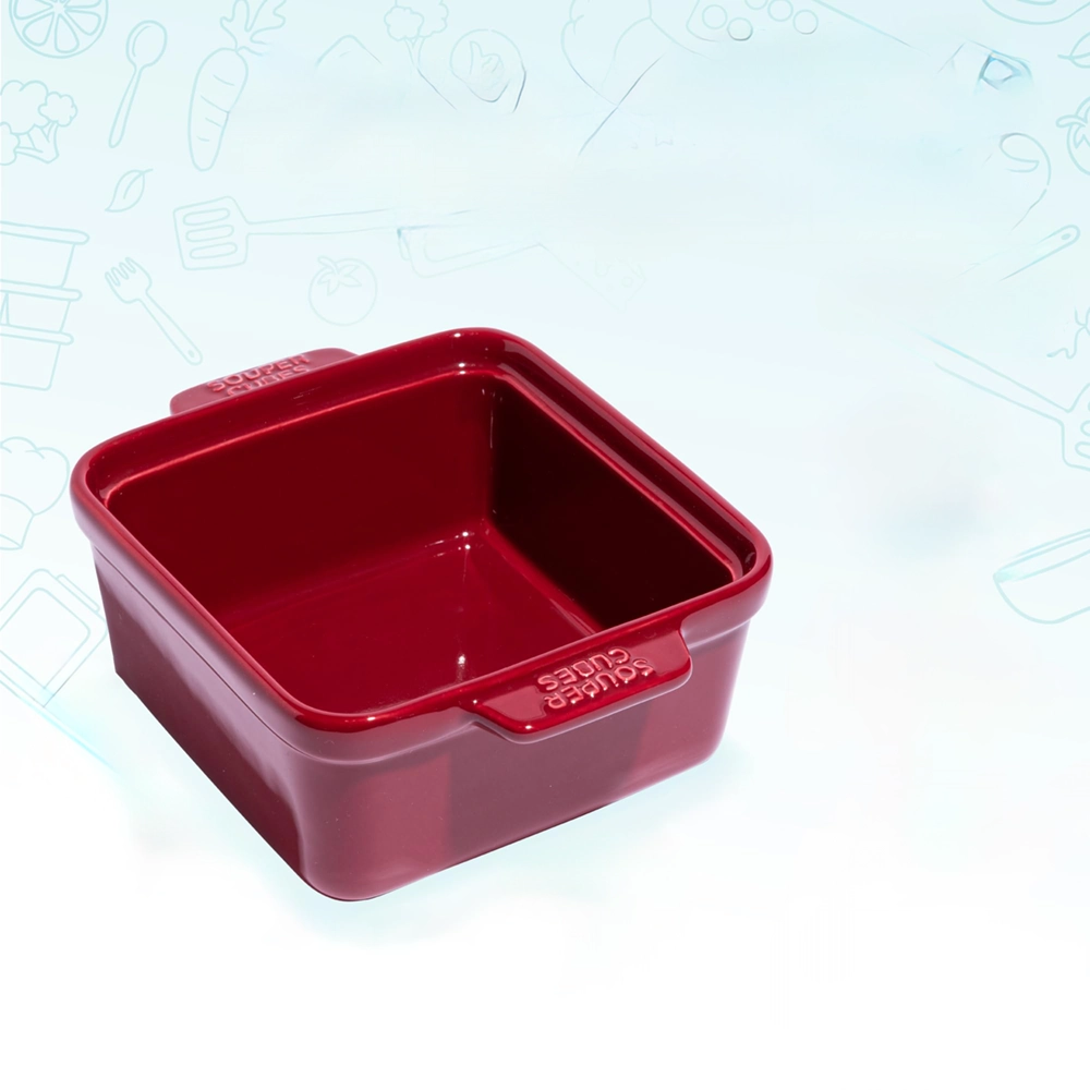 5×5-inch ceramic baking dish with silicone lid, suitable for oven and microwave heating of single-serving meals. Made of high-quality stoneware, 2-pack in cranberry