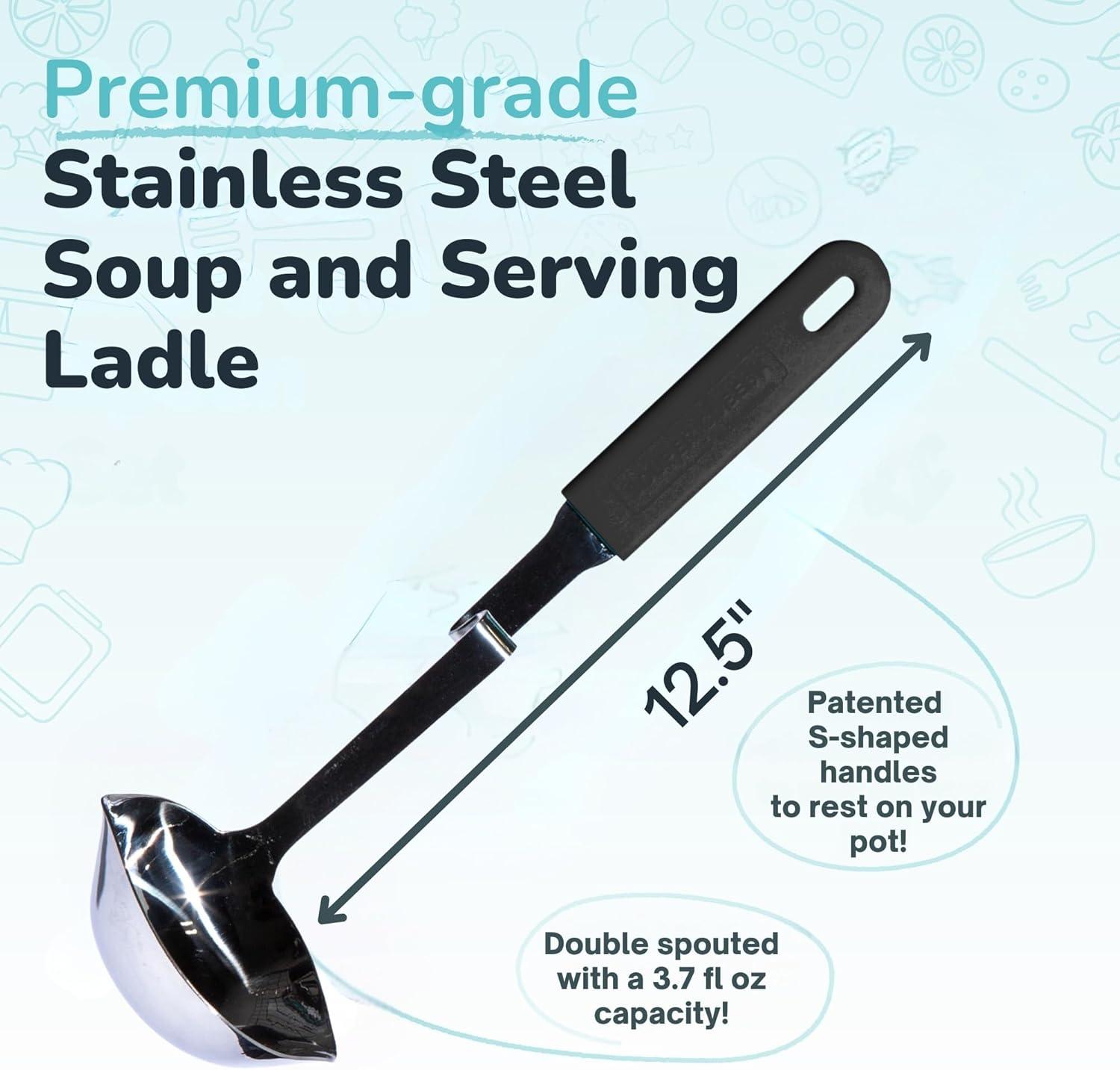 DURABLE STAINLESS STEEL SOUP LADLE: Constructed from thick food-safe stainless steel, our soup ladle is built to handle all the dinners, potlucks, and family get-togethers. The kitchen soup ladle features a food-grade silicone handle that remains cool to the touch while you cook your favorite meals.