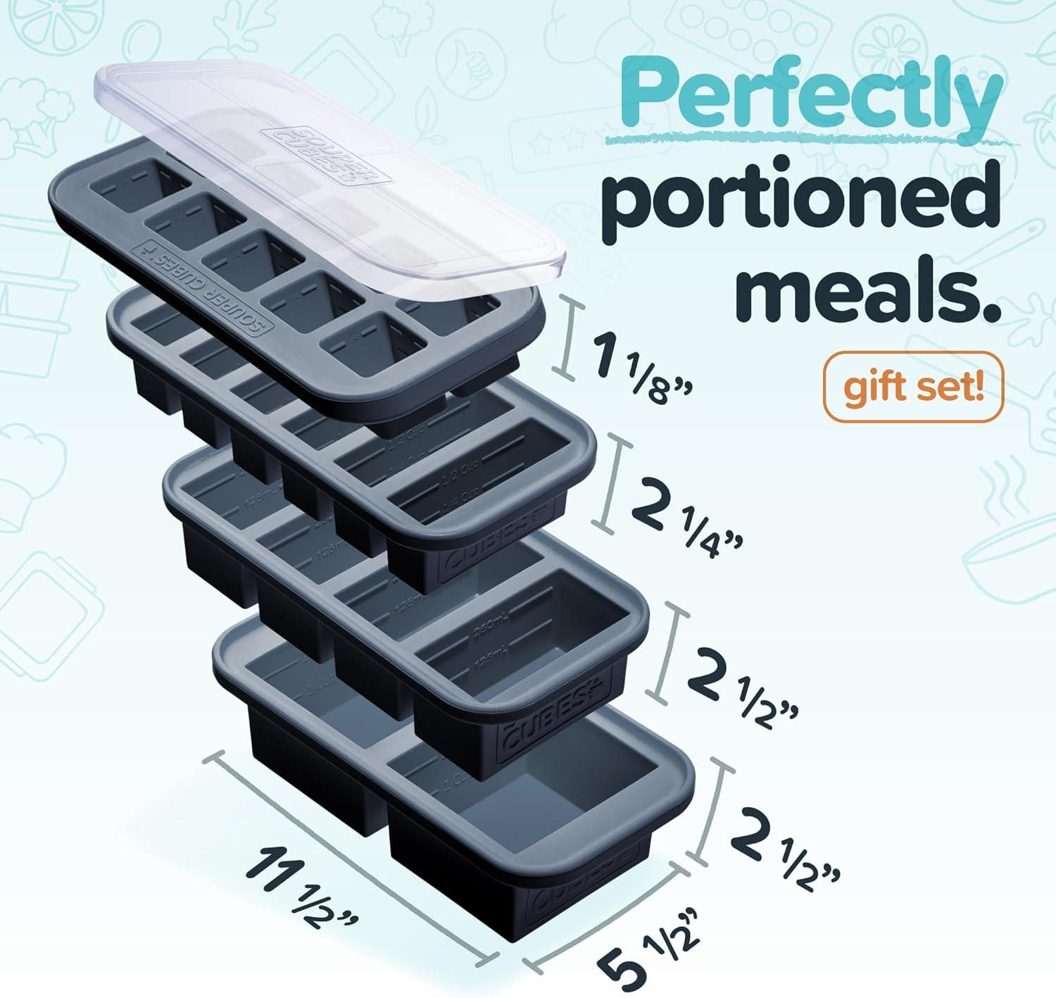 Souper Cubes Silicone Freezer Molds Gift Set with 2 Tbsp, 1/2, 1, and 2 Cup Silicone Freezer Trays With Lids - Meal Prep and Kitchen Essentials Bundle - Kale(Charcoal)